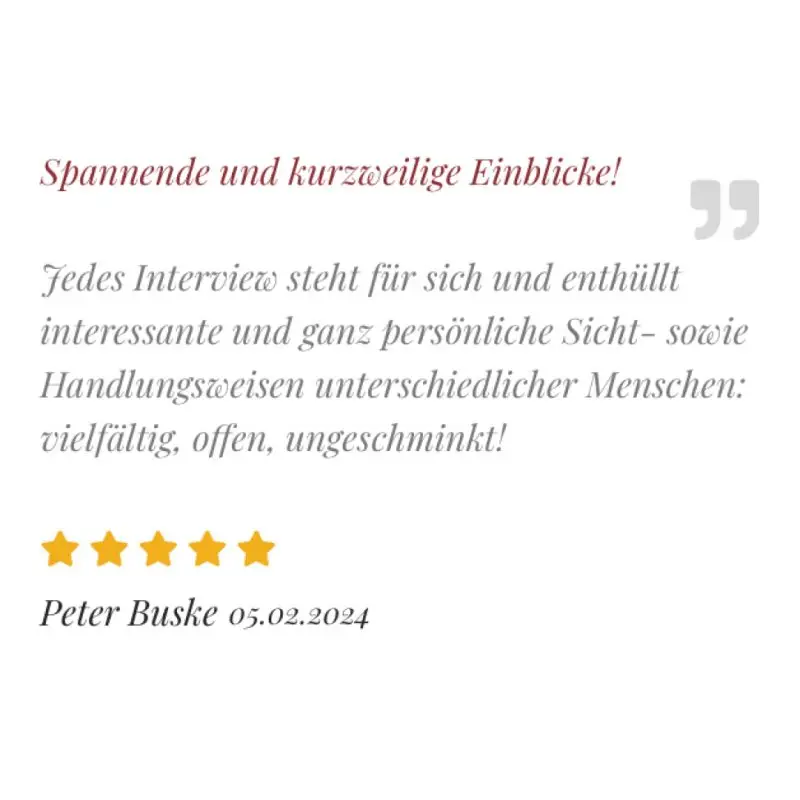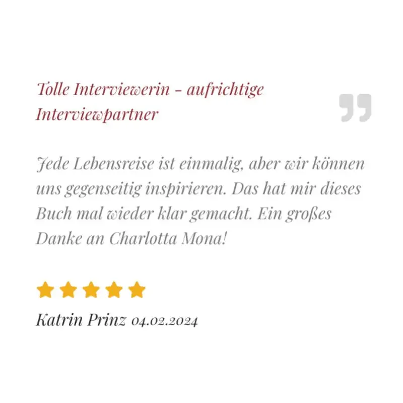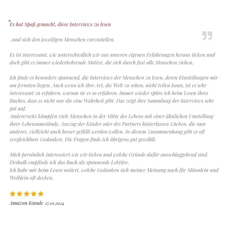 Mit meiner Buchtrilogie Das Interview deines Lebens, Fragen an mich selbst und Notizen an mich selbst, meinem Mind Blog und meinen Coachings möchte ich Räume schaffen: für Klarheit, Selbstverbindung und mutige Entscheidungen. Für Gedanken, Muster und Auslöser, die uns prägen – und für die Freiheit, wir selbst zu sein.
